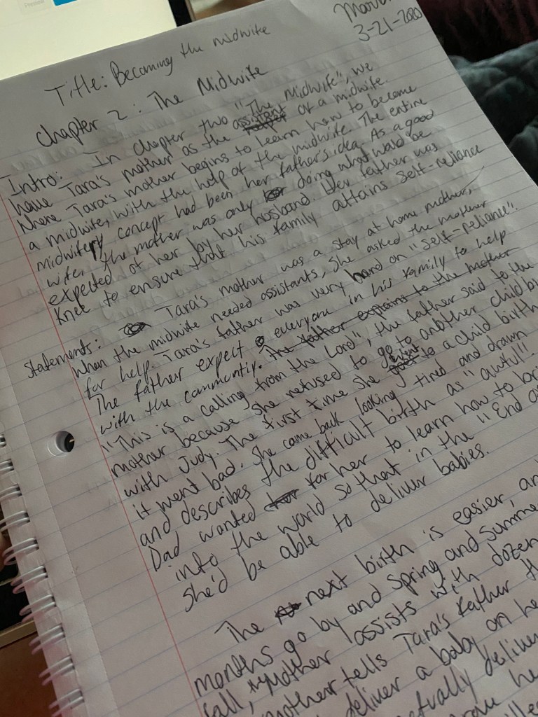 Tara’s mother was a stay at home mother, when the midwife needed assistants, she asked the mother for help. Tara’s father was very hard on “self-reliance”. The father expects everyone in his family to help with the community. “This is a calling from the Lord”’ the father said to the mother because she refused to go to another childbirth with Judy. The first time she went to a childbirth it went bad. She came back looking tired and drawn and describes the difficult birth as “awful”. The Dad wanted for her to learn how to bring babies into the world so that in the “End of Days”, she’d be able to deliver babies.